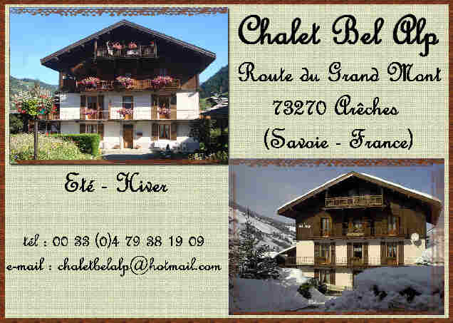 Carole et David sont heureux de vous accueillir, été comme hiver, dans leur maison de famille. Dans les Alpes en Savoie, au coeur du joli village de montagne d'Arêches, la situation privilégiée du "Chalet Bel Alp" vous permet de profiter de la proximité des commerces et l'hiver, des pistes du domaine skiable d'Arêches-Beaufort (1200 - 2300 mètres d'altitude). Cinq confortables appartements, spacieux et indépendants, peuvent accueillir 6 personnes chacun, en location à la semaine. Possibilités de courts séjours (minimum 3 nuitées) à certaines périodes et hors vacances scolaires.